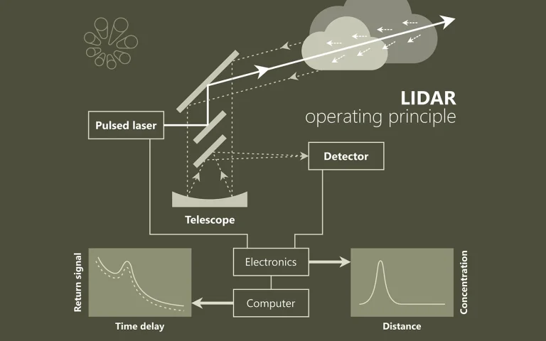 LIDAR sendet kurze Laserpulse aus, die an Partikeln, Aerosolen oder Molekülen in der Atmosphäre gestreut und von einem Teleskop detektiert werden. Aus der Laufzeit des Lichts wird die Entfernung berechnet – so entsteht ein räumliches Profil entlang des Strahls. LIDAR nutzt UV-, sichtbares oder nahinfrarotes Licht und eignet sich zur Detektion verschiedenster Materialien – auch in schwer zugänglichen Umgebungen.