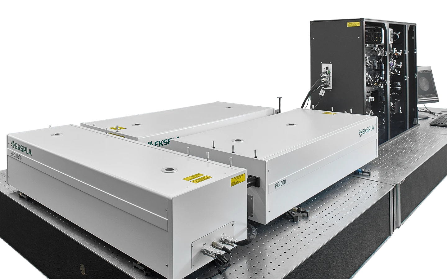 The femtosecond broadband SFG spectrometer measures the entire spectrum of all vibration bands with femtosecond pulses. The femtosecond pulses allow the spectrum to be determined with low excitation energy, which is a critical parameter for biological surfaces in particular.